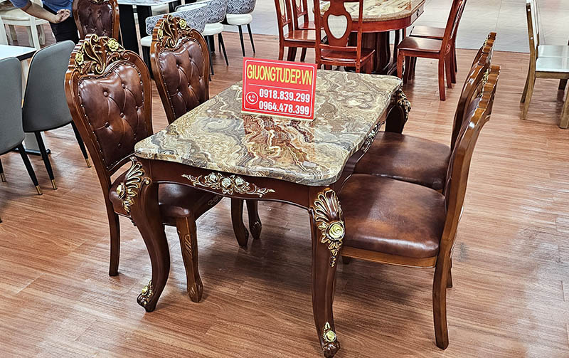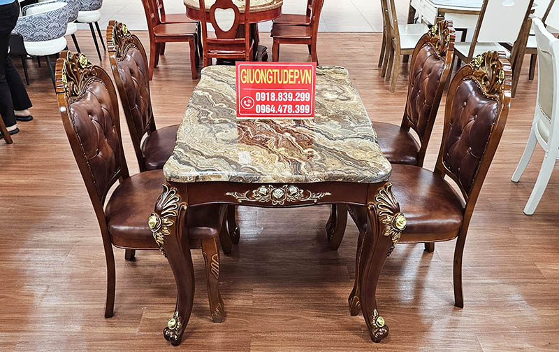 Bộ bàn ăn mặt đá tân cổ điển hoàng gia cao cấp 4 ghế là sự kết hợp hoàn hảo giữa nghệ thuật chạm khắc tinh xảo, chất liệu thượng hạng và phong cách quý tộc châu Âu. Mẫu bàn mang vẻ đẹp bề thế nhưng không chiếm nhiều diện tích, phù hợp với những gia đình yêu thích sự sang trọng tinh tế, đề cao gu thẩm mỹ và đẳng cấp sống.