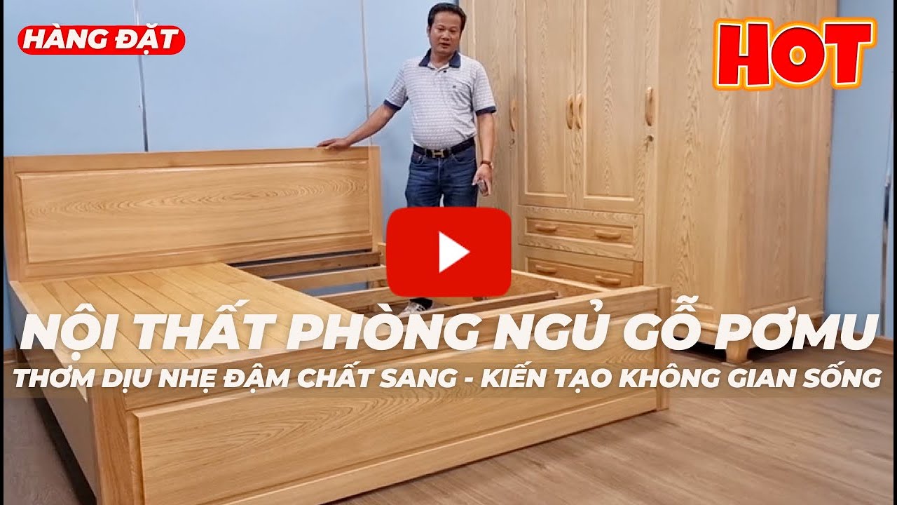 Giường ngủ gỗ Pơmu: thiết kế vững chắc, bề mặt nhẵn mịn, đầu giường tinh tế, mang lại cảm giác thoải mái cho mọi tư thế nghỉ ngơi.