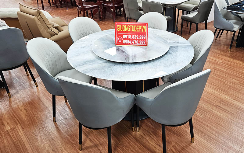 Mẫu bàn ăn tròn mặt đá có mâm xoay 6 ghế là lựa chọn lý tưởng cho những gia đình yêu thích sự tiện nghi, hiện đại nhưng vẫn sang trọng và tinh tế. Thiết kế bàn tròn giúp tạo cảm giác quây quần, gắn kết các thành viên, trong khi mâm xoay ở trung tâm mang đến trải nghiệm sử dụng tiện lợi, đẳng cấp như trong các nhà hàng cao cấp.