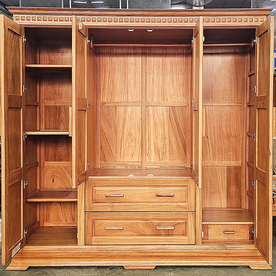 Bên cạnh đó, tủ quần áo gỗ gõ đỏ 3 buồng hiện đại còn sở hữu kiểu dáng nhẹ nhàng thanh lịch, phô diễn tinh tế toàn bộ vẻ đẹp, sự độc đáo của gỗ gõ đỏ và được thiết kế thông minh, rộng rãi, đáp ứng trọn vẹn nhu cầu cất giữ đồ đạc của các gia đình.